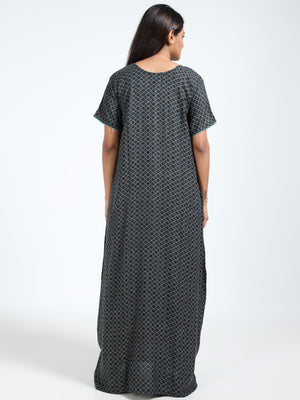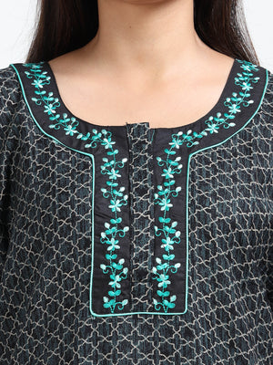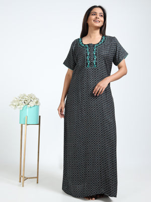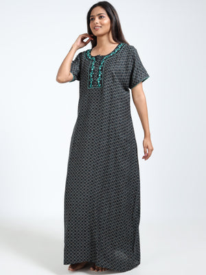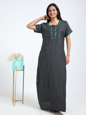 Unwind in elegance with this Alpine cotton nighty, featuring a sophisticated black base with geometric prints and striking green floral embroidery on the neckline. Designed for Indian women, this full-length nightwear offers breathable comfort and a graceful fit for everyday relaxation.