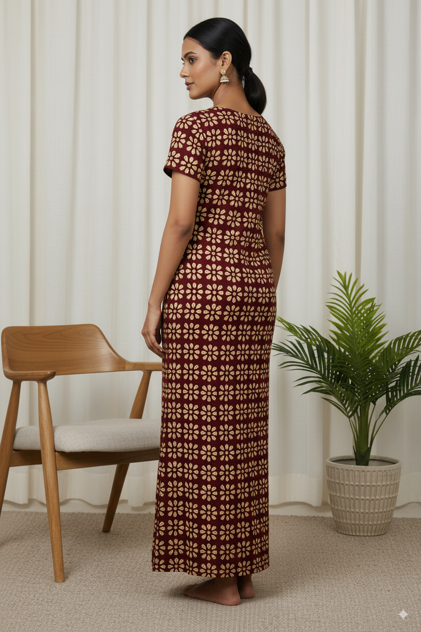 Alpine Cotton Nighty – Maroon Floral Print for Cozy Indian Evenings