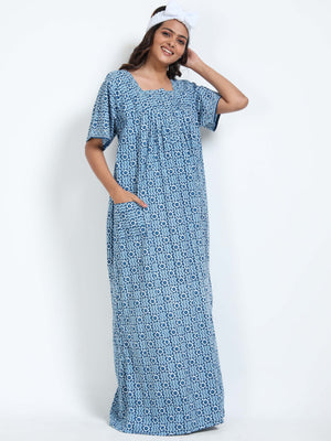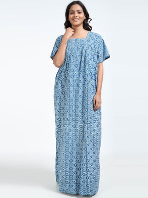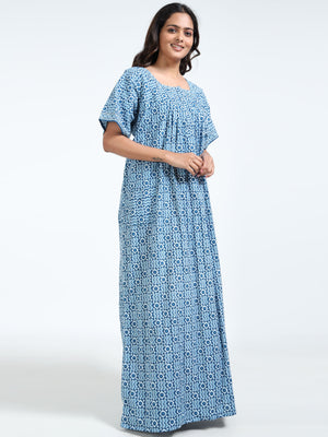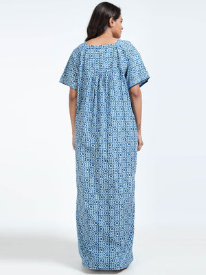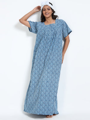 A breezy, ankle-length nighty in soothing blue with an all-over geometric print. Designed with a square notch neckline and contrast border at the yoke and sleeve cuffs. Soft, breathable cotton keeps you cool; gentle front pleats add extra ease. Finished with short sleeves, a relaxed straight fit, and a handy side pocket for everyday comfort. Ideal for lounge or bedtime wear.