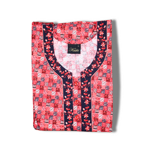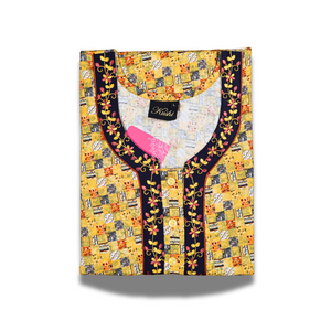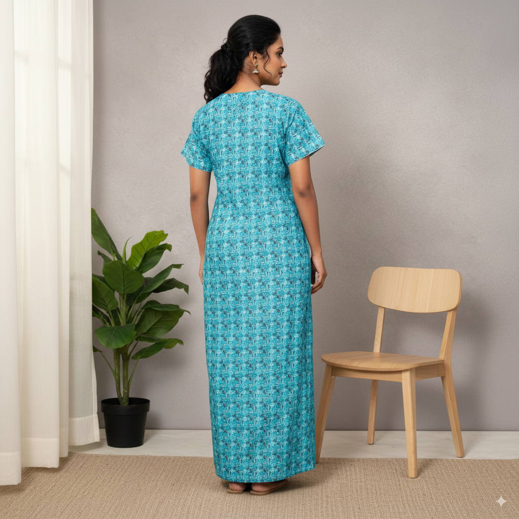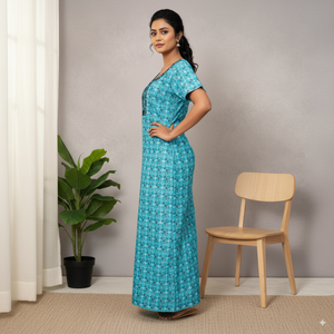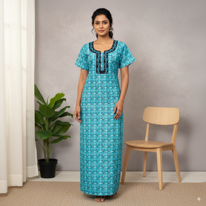 This elegant aqua blue cotton nighty features an all-over geometric floral print and a striking black yoke with intricate blue embroidery. The short sleeves and square neckline design ensure both style and comfort, making it ideal for daily wear. Crafted from soft, breathable fabric, it offers a relaxed fit for all-day ease.