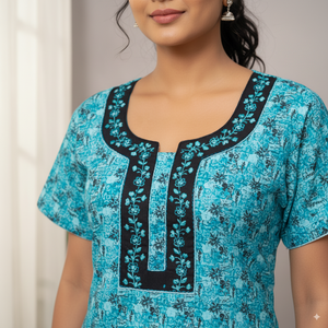 Aqua Blue Printed Cotton Nighty with Black Embroidered Yoke