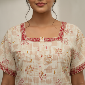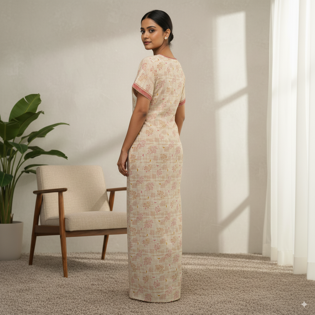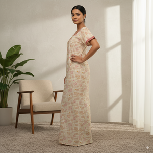 This ankle-length cotton nighty features a soft beige base adorned with subtle geometric and floral patterns in muted red and gold tones. The square neckline and sleeve edges are highlighted with an intricate red printed border, adding a traditional charm. Designed for comfort and ease of movement, this nighty is perfect for daily wear and relaxed evenings at home.