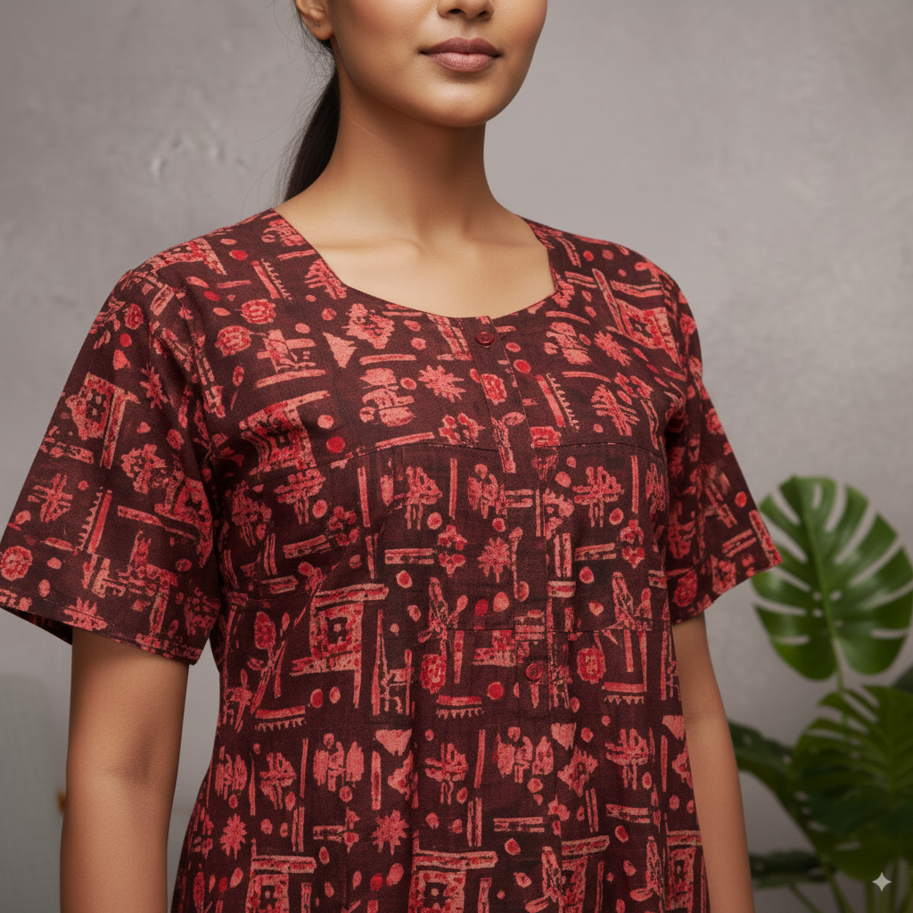 This striking full-length women’s nighty features a bold black base adorned with vibrant red abstract and geometric patterns. The square neckline is finished with matching red piping, and the short sleeves add to its easy-wear comfort. Designed for relaxed home wear and nighttime comfort, this nighty blends eye-catching design with a free-flowing fit.