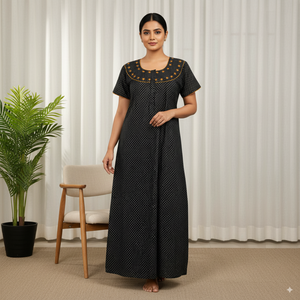 This elegant black cotton nighty from Kushi Nighties combines comfort with a touch of sophistication. Adorned with delicate white polka dots all over, it features a square neckline beautifully detailed with vibrant orange floral embroidery and contrast piping on the sleeves and neck. The short sleeves and ankle-length design make it perfect for both day and night wear. Crafted from breathable cotton, this nighty ensures all-day comfort while maintaining a stylish look.