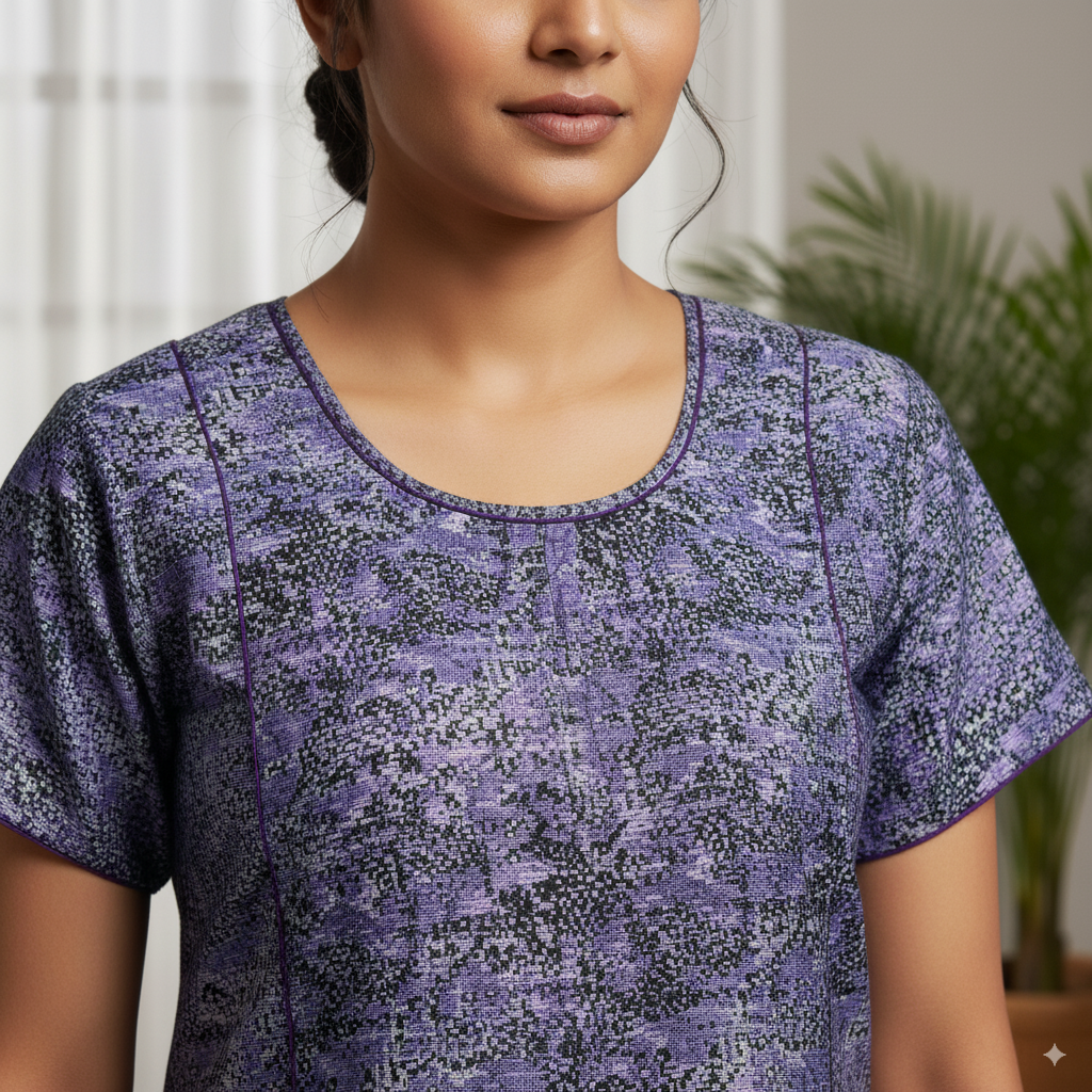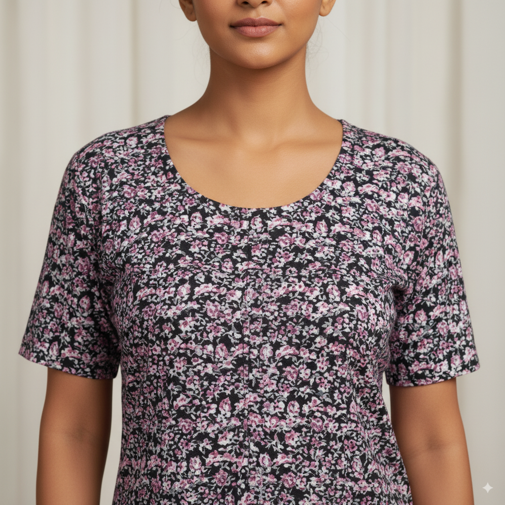 This elegant black cotton nighty features an all-over floral print in soft pink and white tones, giving it a graceful and feminine appeal. Designed with a comfortable round neckline and short sleeves, it offers a relaxed fit perfect for both nightwear and loungewear. The breathable cotton fabric ensures comfort throughout the day.