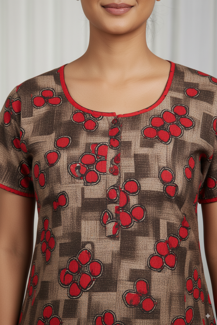 Bold Black & Brown Printed Nighty with Red Floral Motifs – Cotton Comfort
