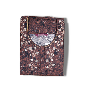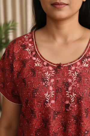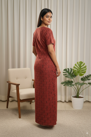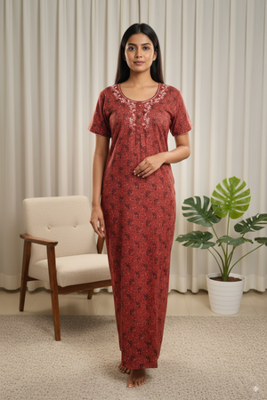 Brick Red Printed Cotton Nighty with Embroidered Neckline
