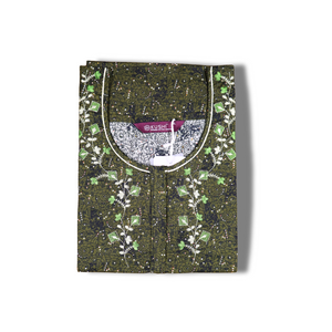This full-length cotton nighty in a rich brick red shade is adorned with subtle floral prints and delicate white embroidery around the neckline. Designed with short sleeves and a button placket for ease, it ensures maximum comfort while maintaining a stylish look. The breathable cotton fabric makes it perfect for bedtime, daily wear, and casual lounging at home.