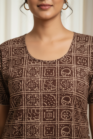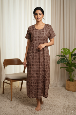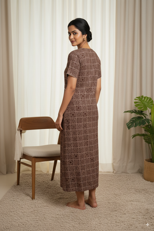 Stay relaxed and stylish with this brown cotton nighty featuring an elegant all-over geometric block print design. The simple round neckline and short sleeves provide a comfortable fit, making it perfect for both day and night wear. Crafted from soft breathable cotton, this nighty offers long-lasting comfort, ideal for everyday use and lounging.