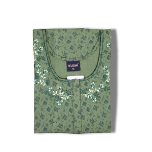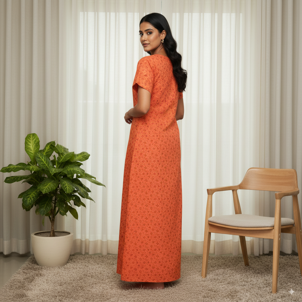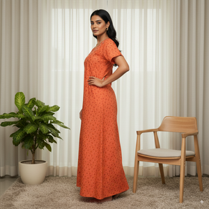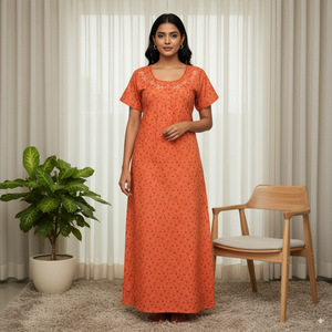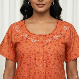 This burnt orange cotton nighty features a subtle all-over floral print paired with a beautifully embroidered round neckline for an elegant touch. Designed with short sleeves and a relaxed fit, it ensures maximum comfort for day and night wear. Made from breathable cotton fabric, it offers a soft feel against the skin, making it a perfect choice for everyday home wear.