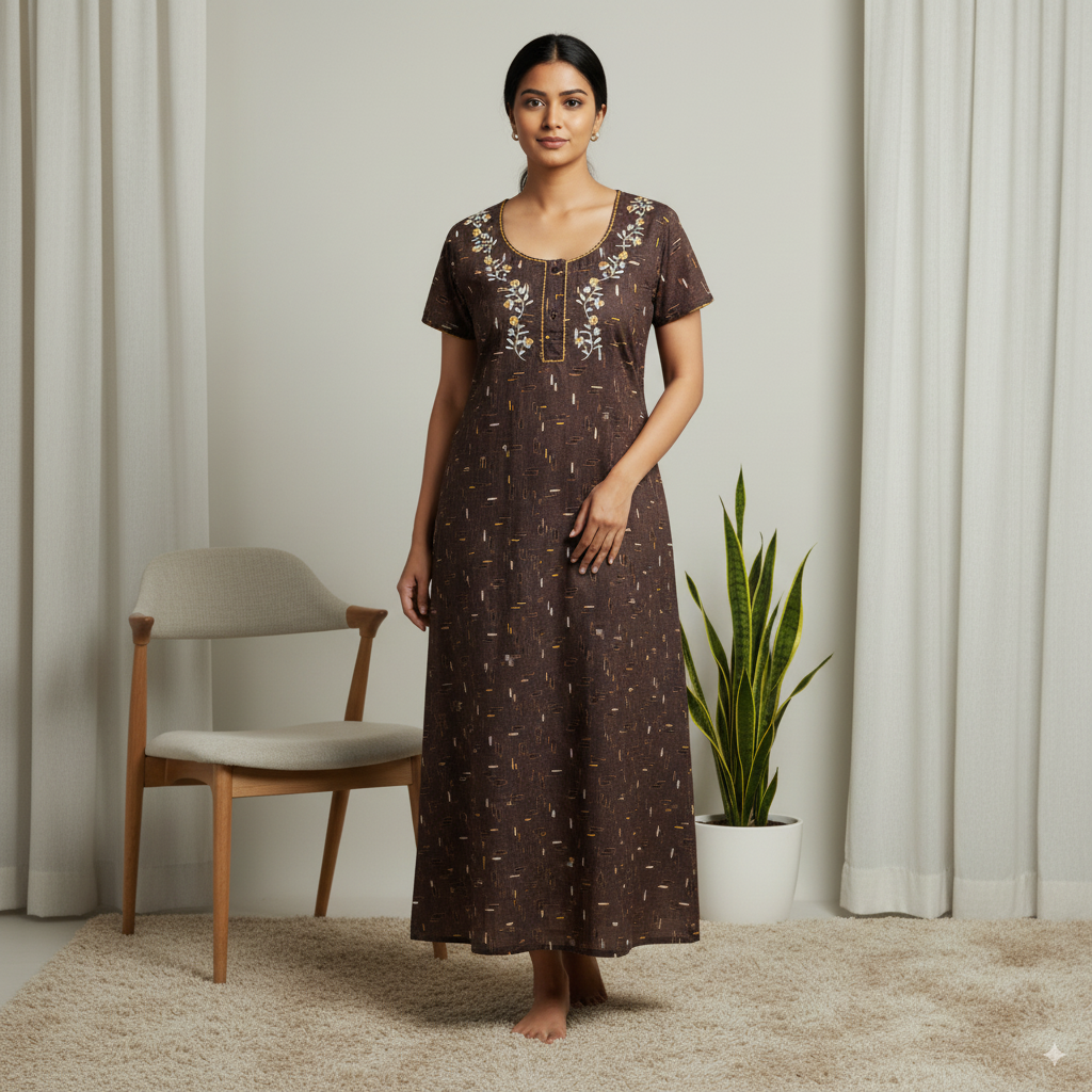 Step into effortless elegance with this charcoal grey cotton nighty, designed with a modern linear print and beautifully embroidered neckline. Featuring charming red floral embroidery, soft contrast piping, and a comfortable button-front placket, this full-length nighty blends comfort with a classy touch. Perfect for lounging or sleeping, its breathable cotton fabric and relaxed fit make it a must-have in your nightwear wardrobe.