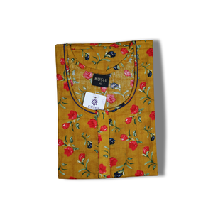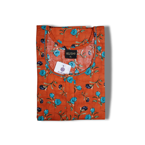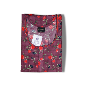 Embrace timeless elegance with this dark green cotton nighty, highlighted with a bold red rose floral print and hints of navy blue blossoms. The square neckline is accentuated with a red piping finish, adding a touch of contrast and charm. Crafted in breathable cotton, this nighty is perfect for relaxed evenings and comfortable sleep. Its soft fabric and floral motifs make it both stylish and cozy for everyday wear.