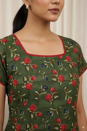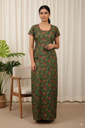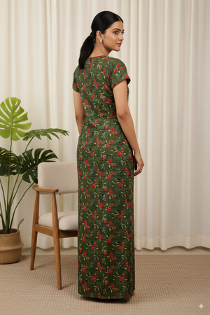 Dark Green Floral Cotton Nighty with Red Rose Print