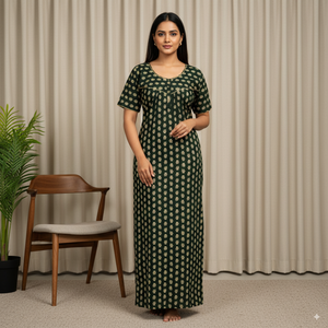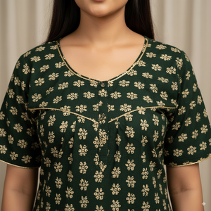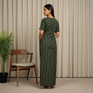 Dark Green Floral Printed Cotton Nighty