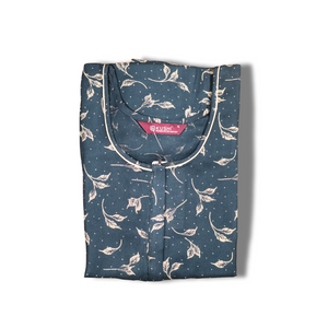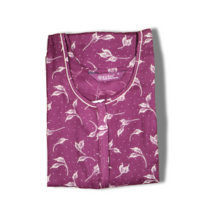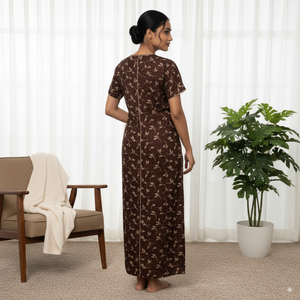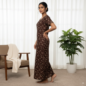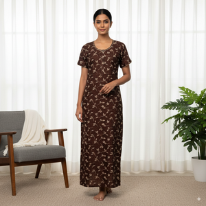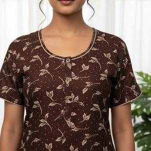 This ankle-length women’s nighty is crafted from soft cotton fabric for maximum comfort. It features a rich brown base with an all-over floral beige print, short sleeves, and a round neckline with subtle piping. Designed for daily wear, this nighty combines comfort and elegance, making it perfect for both day and night use.