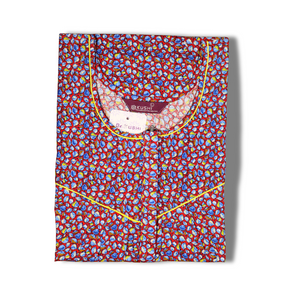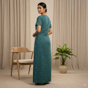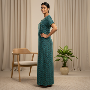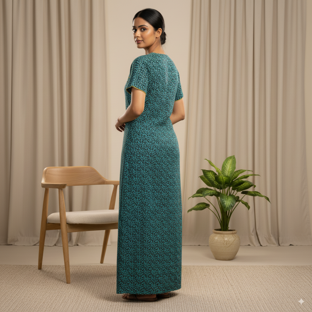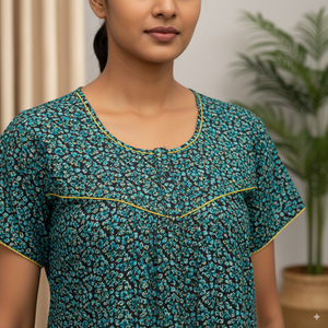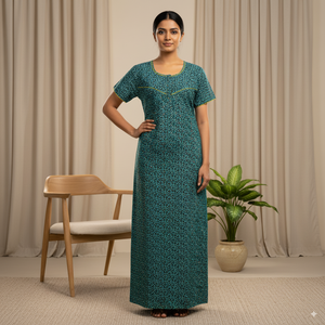 This beautiful ankle-length nighty combines comfort and elegance with its rich green base adorned with tiny multicoloured floral motifs. The design is enhanced by delicate yellow piping around the neckline and sleeve edges, adding a fresh and vibrant touch. Crafted from soft, breathable fabric, this nighty ensures all-day and night comfort while maintaining a stylish look for home wear.