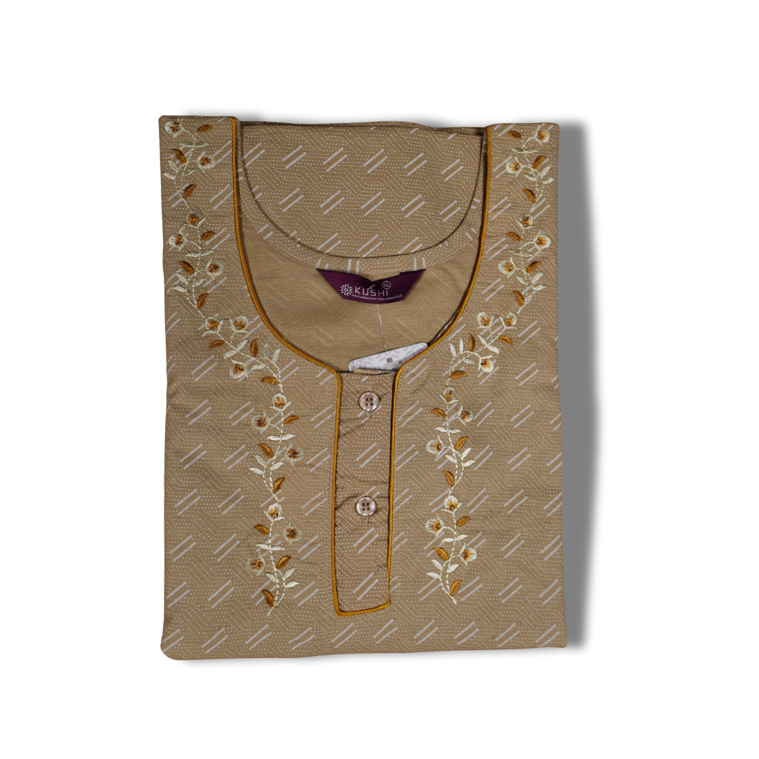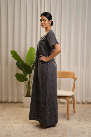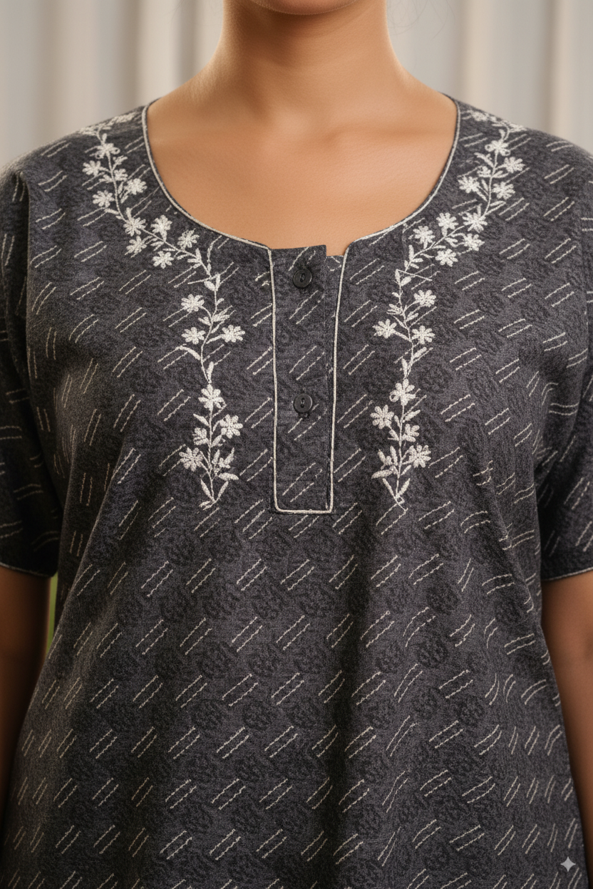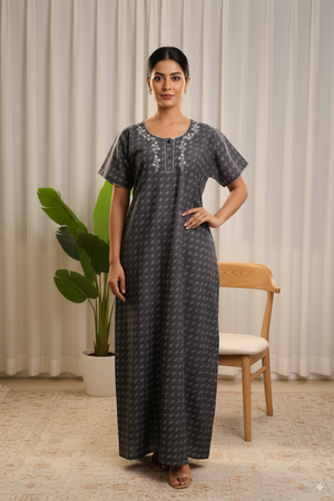 Stay comfortable and stylish with this grey cotton nighty featuring an all-over subtle print and beautifully embroidered neckline. Designed with short sleeves and a relaxed fit, this nighty is perfect for both day and night wear. The breathable cotton fabric ensures maximum comfort, while the modern yet traditional design makes it an ideal choice for everyday use.