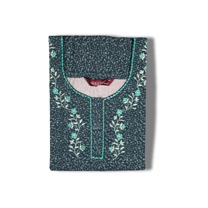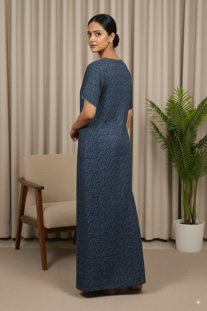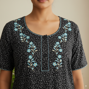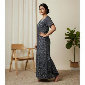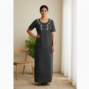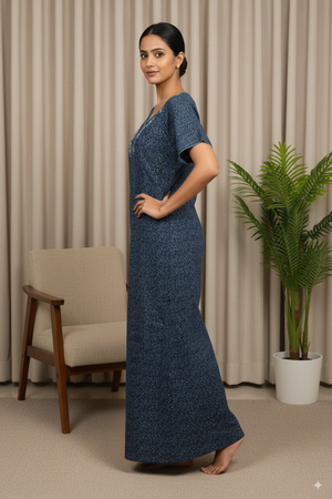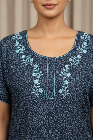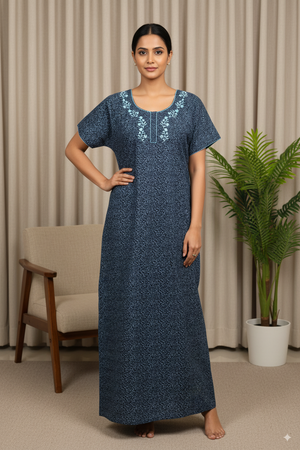 This elegant cotton nighty in deep navy blue offers a perfect blend of comfort and style. Featuring subtle all-over prints and a delicately embroidered neckline in light blue, it enhances your nightwear collection with sophistication. The breathable cotton fabric ensures all-day comfort, while the loose fit allows ease of movement, making it ideal for both home wear and nighttime relaxation.