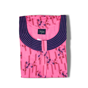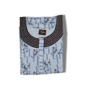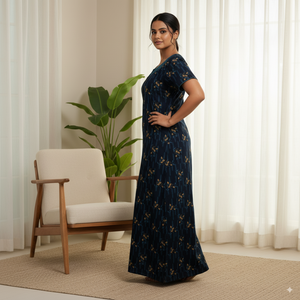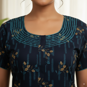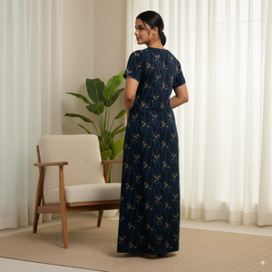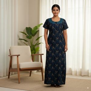 This full-length cotton nighty features a rich navy blue base adorned with subtle geometric lines and scattered brown floral prints for a touch of elegance. The round neckline is highlighted with multiple rows of turquoise piping, adding a stylish contrast. Designed with short sleeves and a relaxed fit, this nighty offers all-day comfort and is perfect for both home wear and nightwear.