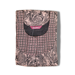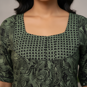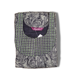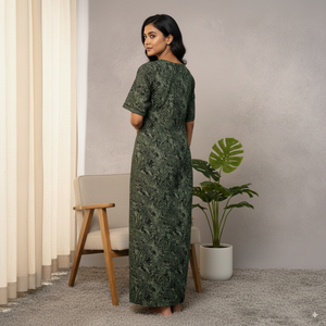 This ankle-length olive green nighty features an intricate all-over paisley print and a beautifully embroidered square neckline in a contrasting grid pattern. Designed with short sleeves and a relaxed fit, it offers both comfort and elegance. Ideal for both nightwear and relaxed home wear, the breathable fabric ensures ease of movement while maintaining a stylish look.