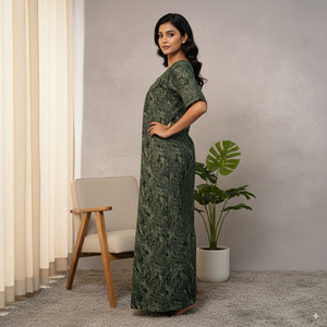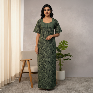 Elegant Olive Green Printed Nighty with Embroidered Neckline