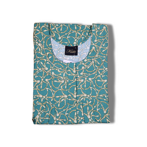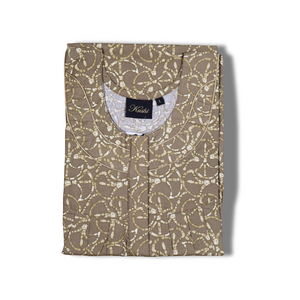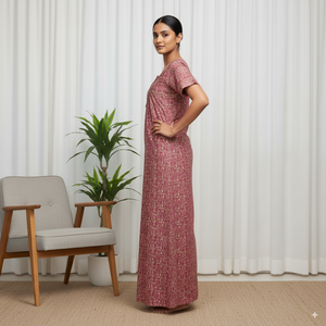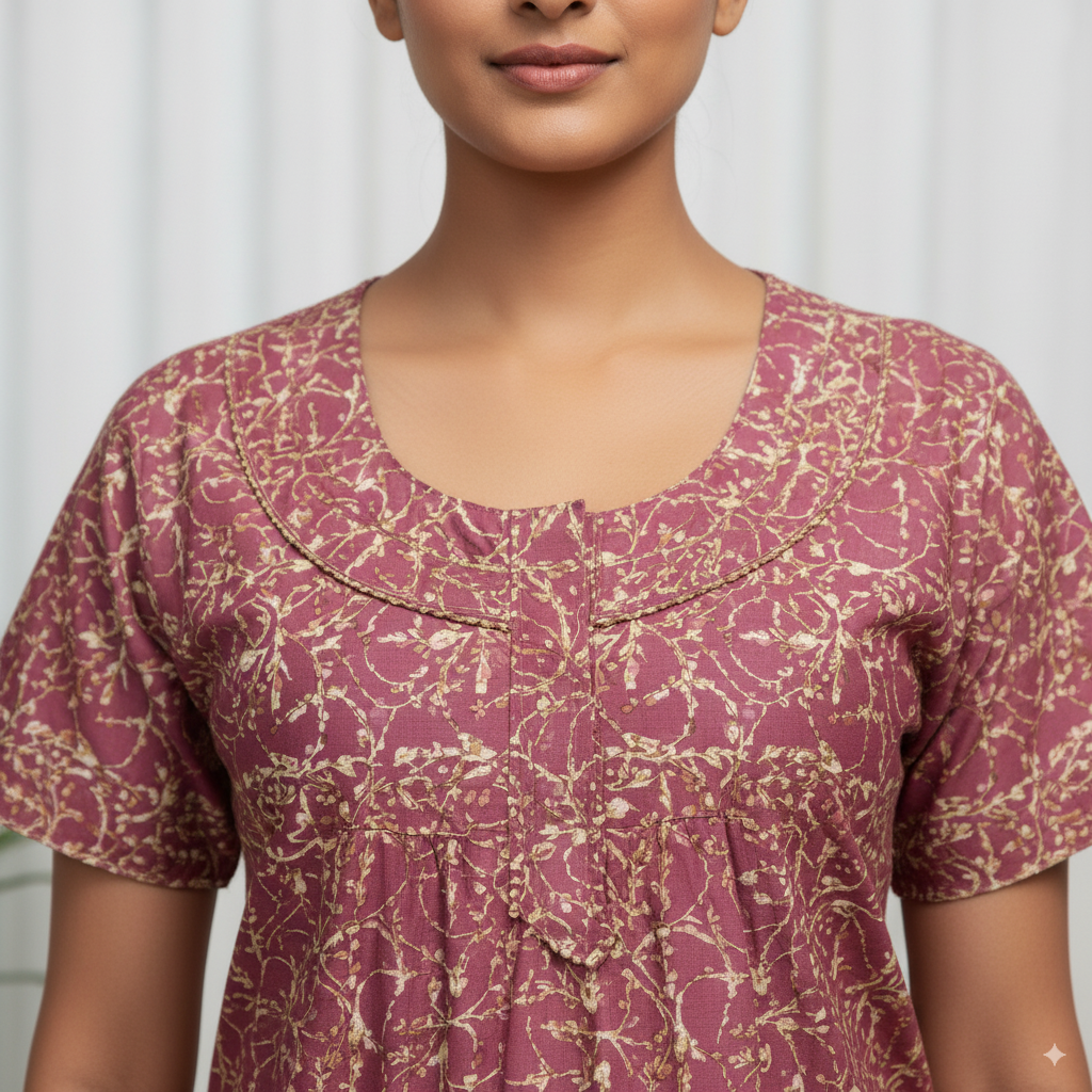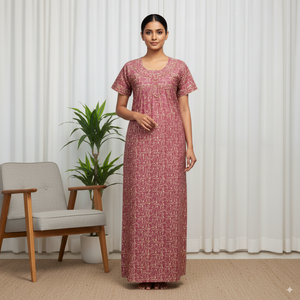 This stylish women’s nighty is crafted from a satin-finish fabric, offering a smooth texture and comfortable wear. The design features a rich pink base with an all-over golden-yellow print, adding a touch of elegance. The short sleeves and relaxed fit make it ideal for both day and night wear, combining luxury with comfort.