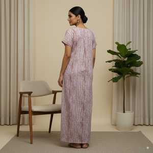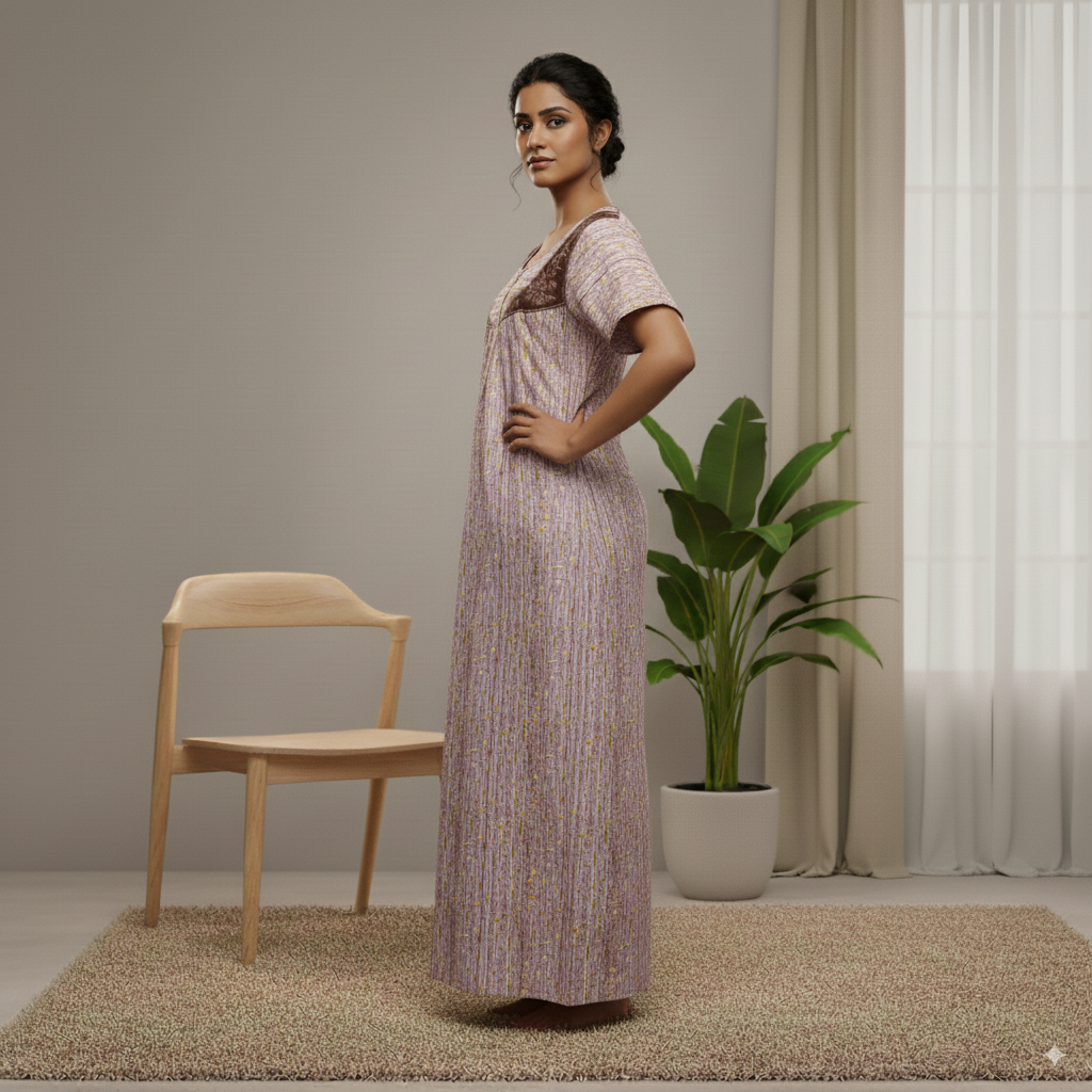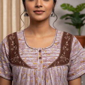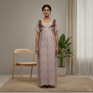 This is a stylish satin nightgown designed for ultimate comfort and a touch of elegance. The gown features a soft striped lavender and beige base with delicate floral accents in mustard yellow and red tones. The standout detail is the deep brown embroidered yoke on the shoulders and neckline, adding a traditional yet fashionable charm. With its flowing cut, short sleeves, and lightweight fabric, it is perfect for evening relaxation or nightwear.