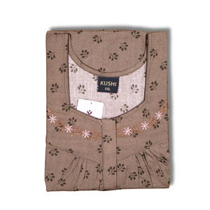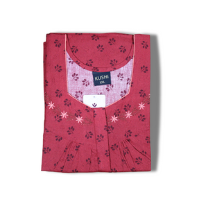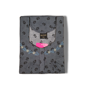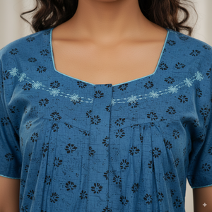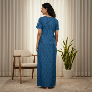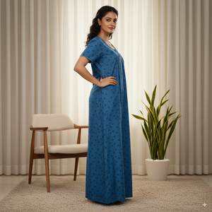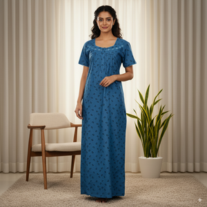This full-length cotton nighty in teal blue offers a perfect blend of comfort and elegance. Designed with delicate navy floral prints and soft embroidery around the neckline, it ensures a relaxed fit for all-day and night wear. Crafted from breathable fabric, this piece is ideal for warm climates and everyday use.