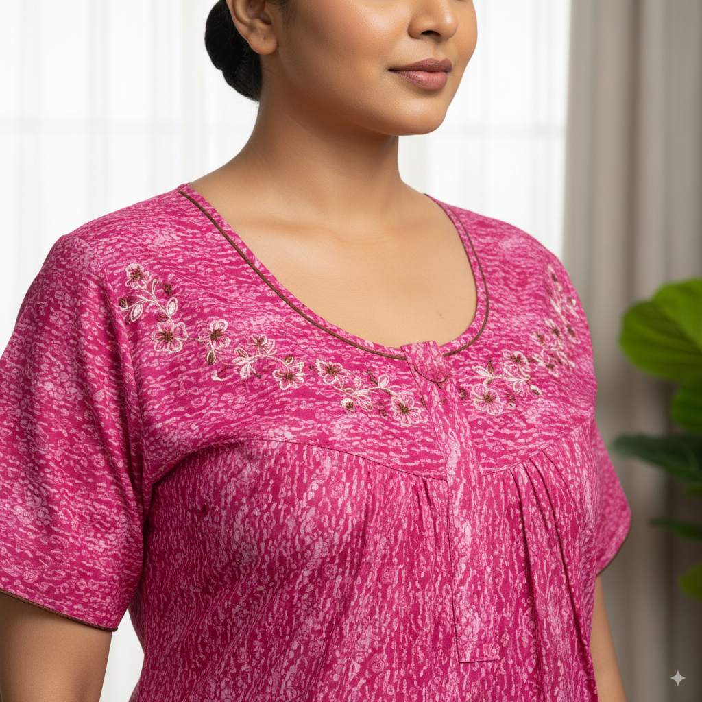 Fuchsia Pink Textured Nighty with Embroidered Scoop Neck
