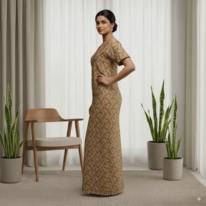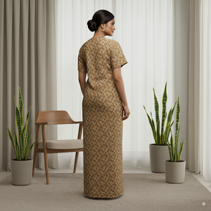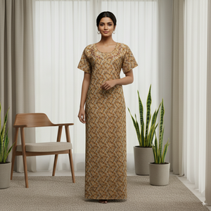 Golden Brown Printed Cotton Nighty with Embroidered Neck