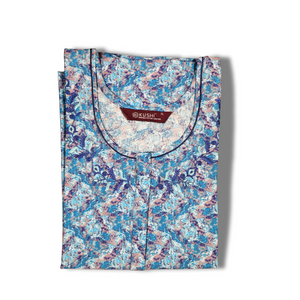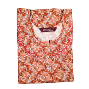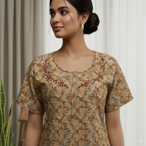 This elegant cotton nighty features a golden-brown base with an all-over geometric pattern, perfect for both comfort and style. The neckline is beautifully highlighted with delicate floral embroidery in soft red and beige shades, adding a graceful touch. Designed with short sleeves and ankle length, this nighty ensures ease of movement, breathability, and all-day comfort.
