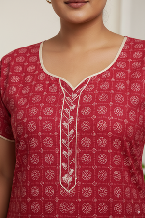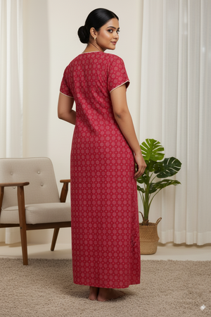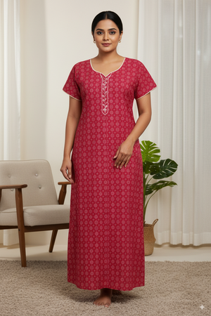 Feel effortlessly elegant in this maroon cotton nighty, designed with a charming all-over print and detailed white embroidery along the V-slit neckline—perfect for daily relaxation and night-time comfort.