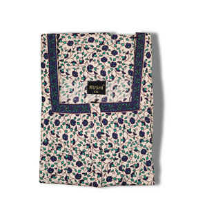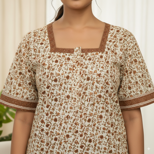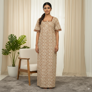 This Jaipur Cotton nighty is designed in a soft beige base with an all-over delicate brown floral print, perfect for comfortable daily wear. It features a square neckline with contrasting brown borders and matching sleeve edges, giving it a traditional yet stylish look. The breathable cotton fabric makes it ideal for long hours of wear, especially in warm climates.