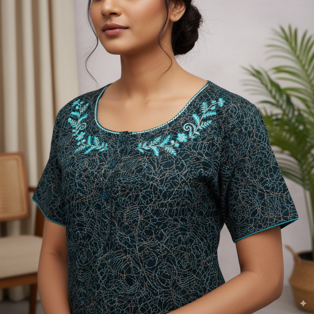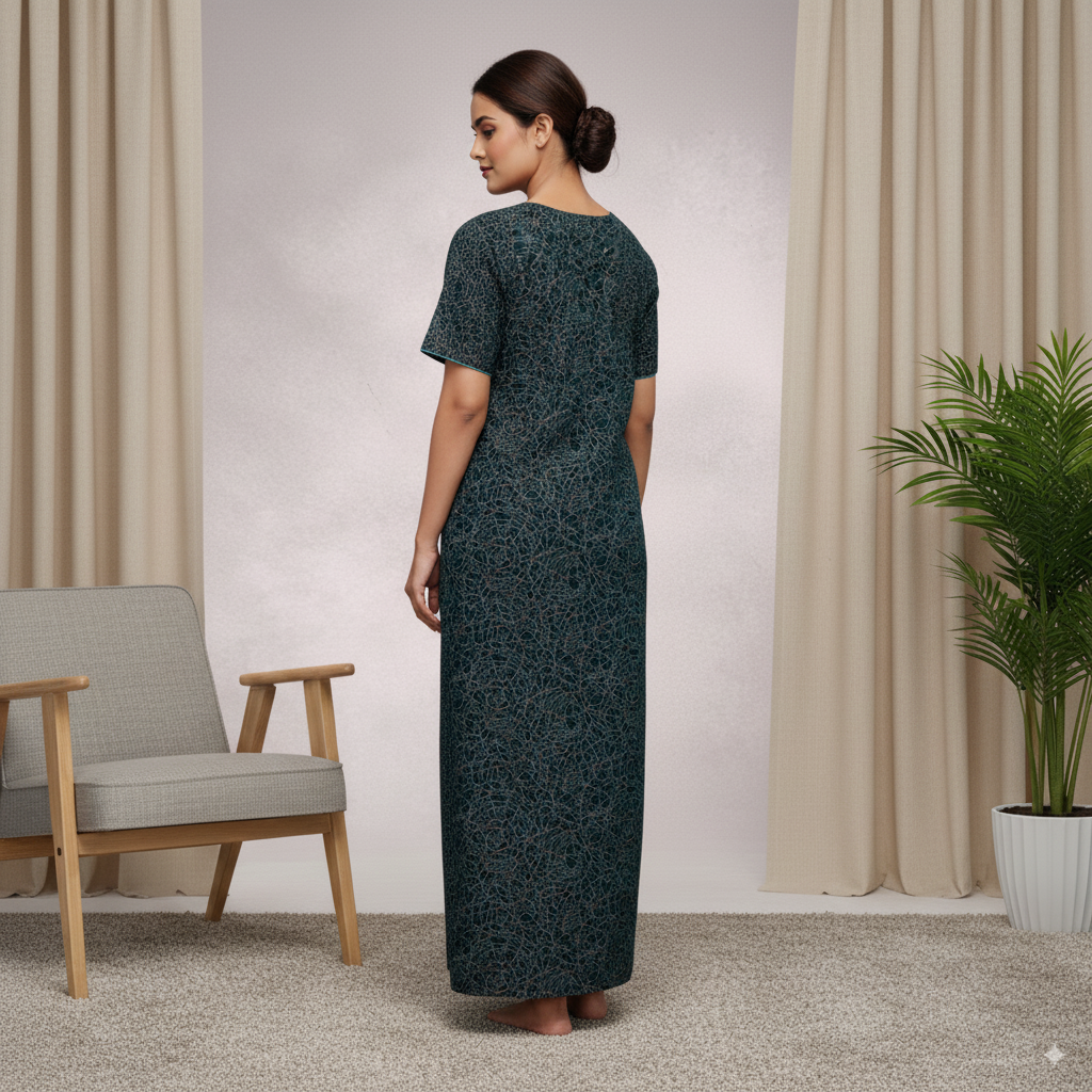 Experience ultimate nighttime comfort with the Premium Cotton Nighty, featuring a soft teal-black base adorned with delicate floral embroidery around the neckline. Crafted from breathable cotton fabric, this ankle-length nighty ensures a relaxed fit for all-day and night wear. Its intricate pattern and elegant color combination make it a perfect blend of comfort and style, ideal for both home lounging and bedtime.