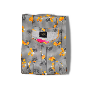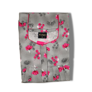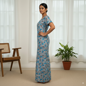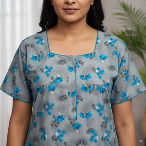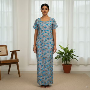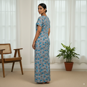 A graceful full-length women’s nighty in a soft light grey base, adorned with an all-over floral pattern in vivid shades of blue and subtle black detailing. Designed with short sleeves, a modest round neckline, and a relaxed fit, this nighty ensures maximum comfort while offering a fresh and elegant appearance for everyday home wear or restful nights.