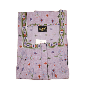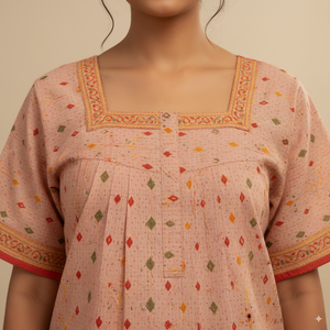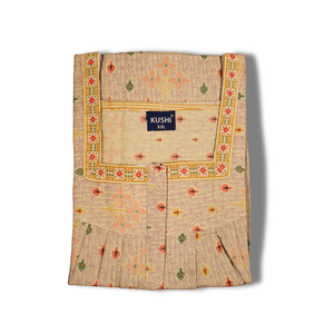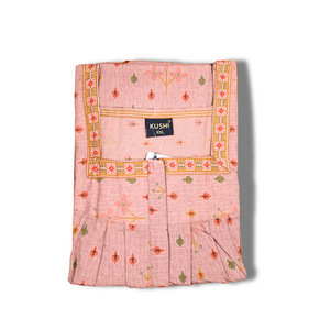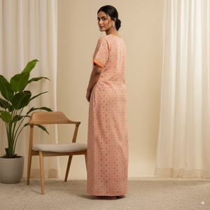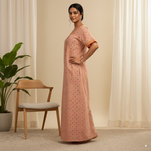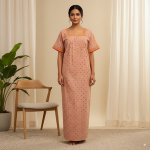 A full-length cotton nighty featuring a soft light peach base adorned with small scattered floral motifs in orange and green. The square neckline and sleeve edges are accented with an intricate orange and yellow printed border for a vibrant touch. With its airy fabric and comfortable fit, this nighty is perfect for daily home wear and relaxed evenings.