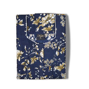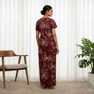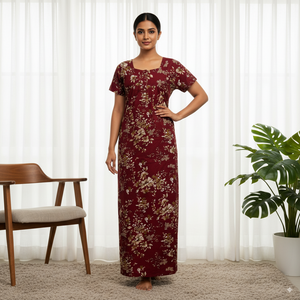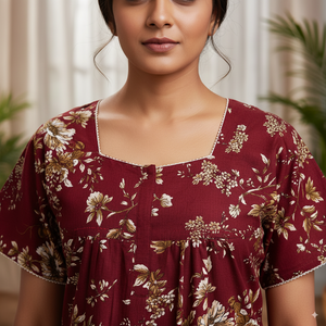 This maroon cotton nighty features an elegant all-over floral print in white and golden yellow, giving it a classic yet stylish look. The square neckline with subtle detailing enhances its feminine charm, while short sleeves ensure comfort. Made from breathable cotton fabric, it provides a soft, airy feel, perfect for both daytime lounging and nighttime wear.
