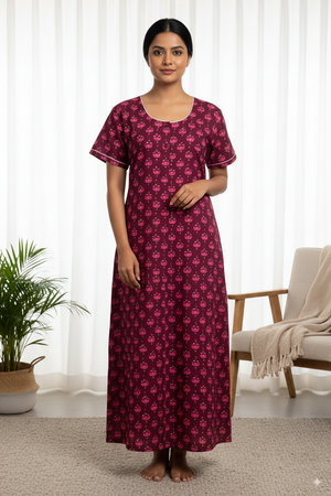 Stay stylish and comfortable all day with this elegant maroon cotton nighty, designed with a charming all-over floral print in shades of pink. The soft cotton fabric ensures breathability and ease of movement, while the scoop neckline and short sleeves offer a relaxed fit. Highlighted with contrast piping on the sleeves and neckline, this ankle-length nighty is perfect for everyday wear or lounging at home.