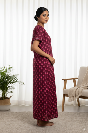 Maroon Floral Printed Cotton Nighty with Contrast Piping
