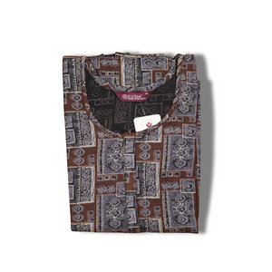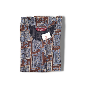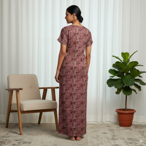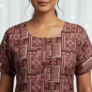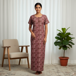 This maroon cotton nighty features an intricate geometric block print design in lighter shades, offering a blend of style and comfort. Designed with short sleeves and a relaxed fit, it ensures all-day and night comfort. Perfect for casual home wear, this nighty combines elegance with breathable fabric for a cozy experience.