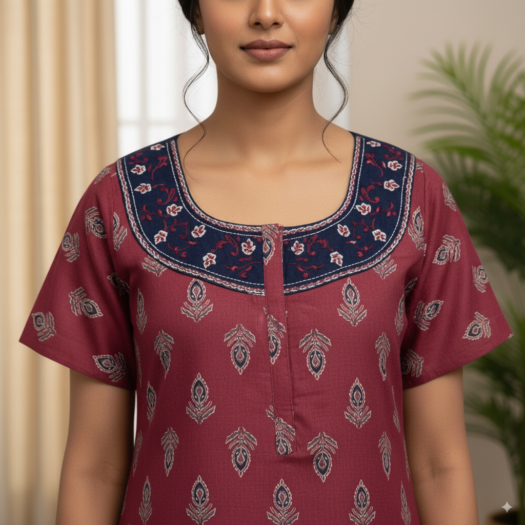This elegant maroon cotton nighty features a soft, breathable fabric adorned with intricate all-over traditional prints. The neckline is beautifully enhanced with navy blue embroidery and floral detailing, adding a touch of sophistication. Designed for ultimate comfort, it offers a relaxed fit ideal for both day and night wear.