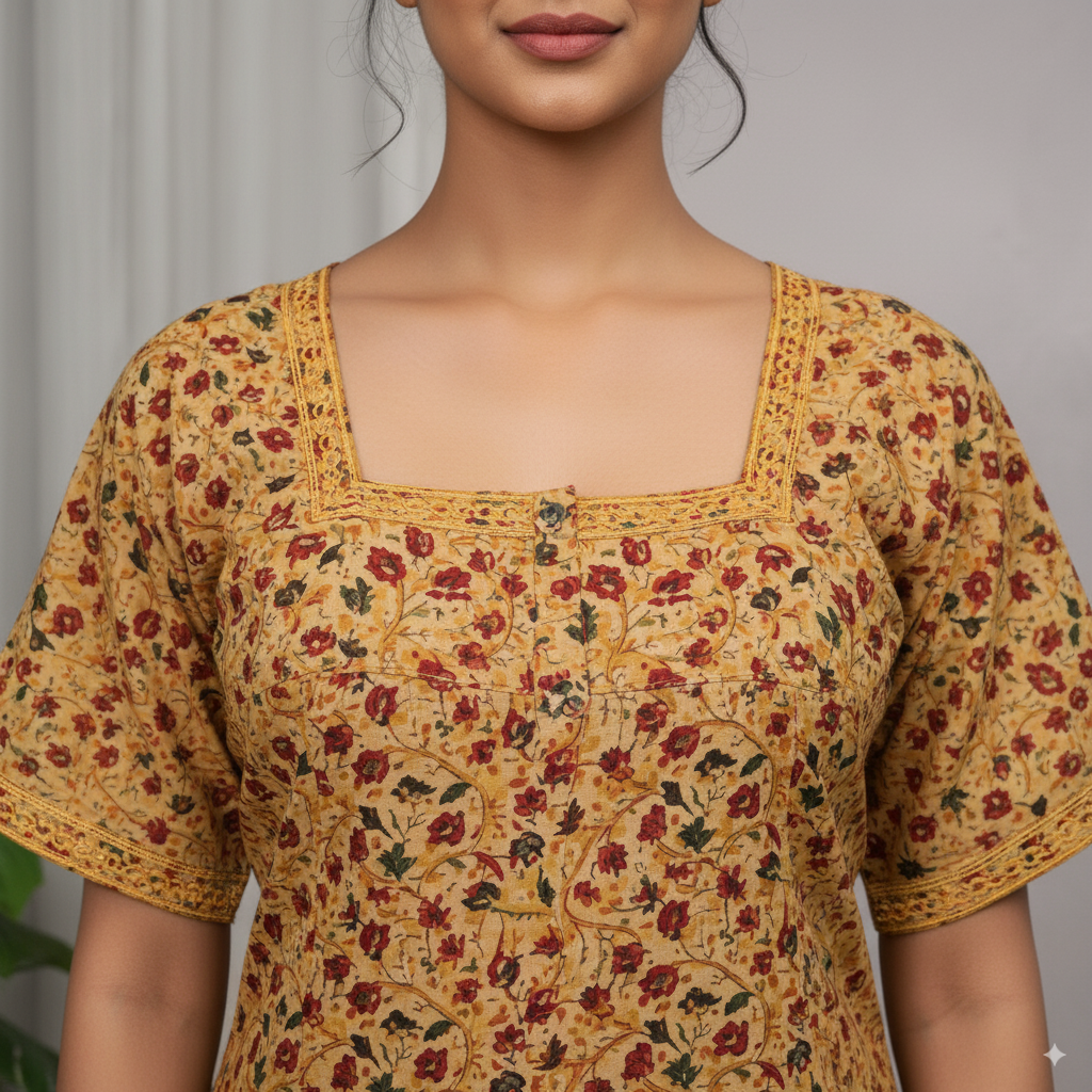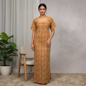 A full-length cotton nighty with a warm mustard yellow base, adorned with an all-over floral print in deep red, green, and black. The square neckline and sleeve edges are finished with an intricate printed border in matching mustard and red, adding a traditional touch. This nighty offers a relaxed fit, making it perfect for comfortable daily and night wear.