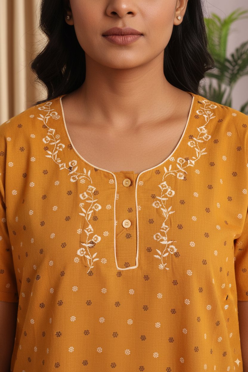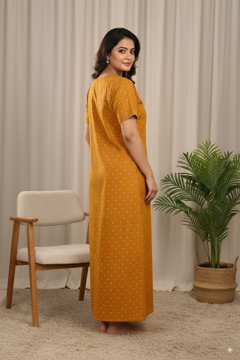This stylish mustard yellow cotton nighty comes with delicate embroidery around the neckline, adding a touch of elegance to your everyday wear. Designed with short sleeves, a round neck with a slit button pattern, and dotted prints all over, it ensures both comfort and grace. Perfect for home wear, bedtime, or casual lounging, this full-length nighty is made from soft breathable fabric, making it suitable for all-day relaxation.