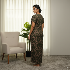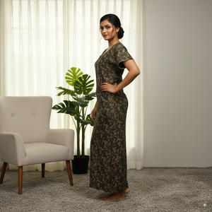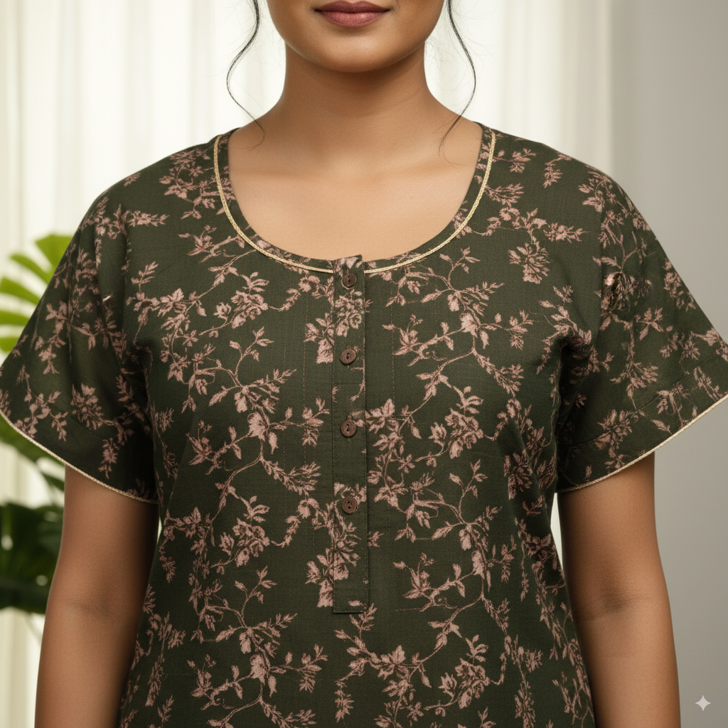 Elegant olive green nighty featuring an all-over delicate beige floral print. Designed with a rounded neckline, front zip closure, and contrast piping on the neck and sleeves for a refined touch. Crafted from soft, breathable fabric for all-day and night comfort.