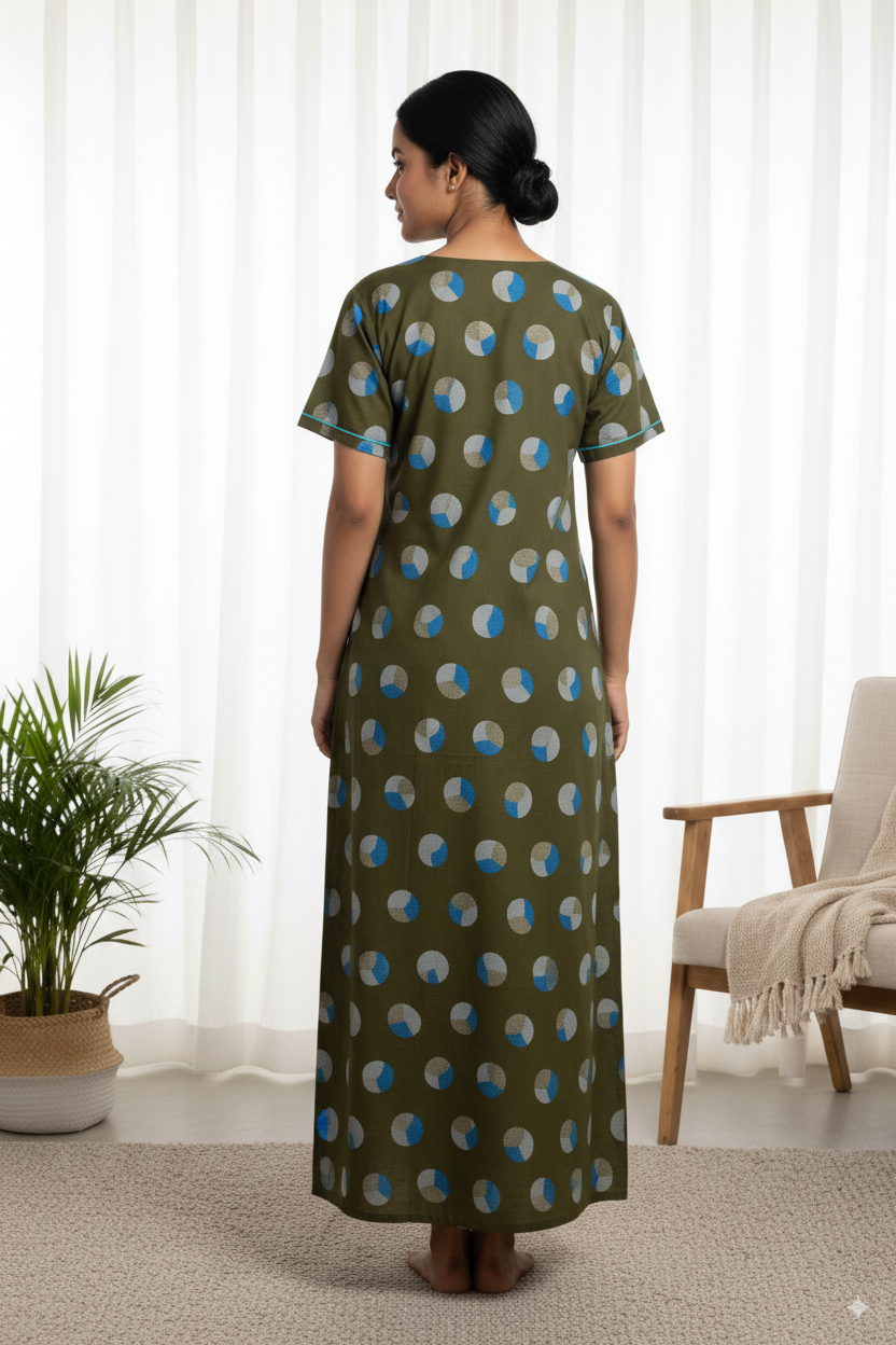 Olive Green Polka Printed Cotton Nighty with Blue Embroidered Neck