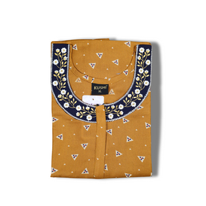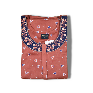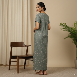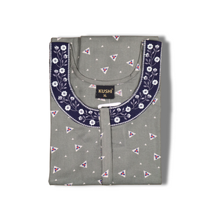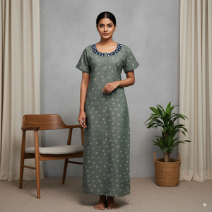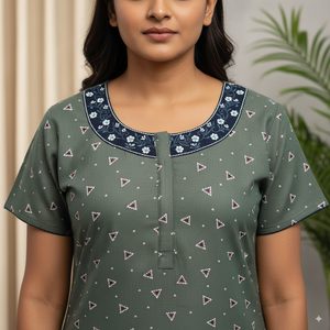 This full-length nighty features a soft olive green base adorned with subtle geometric prints for a contemporary touch. The neckline is highlighted with an intricate navy blue embroidered design, adding elegance and charm. Designed for everyday comfort, the breathable fabric ensures ease of movement while maintaining a stylish appeal.
