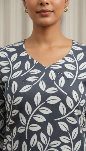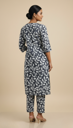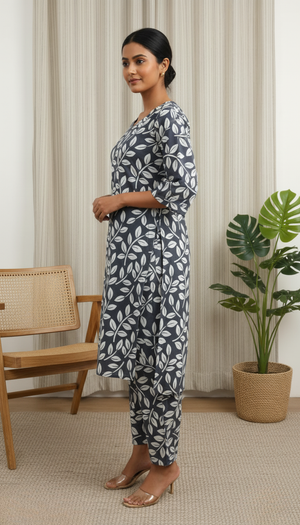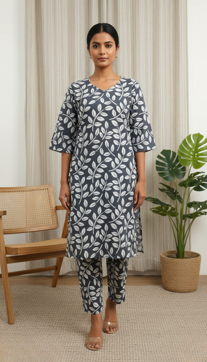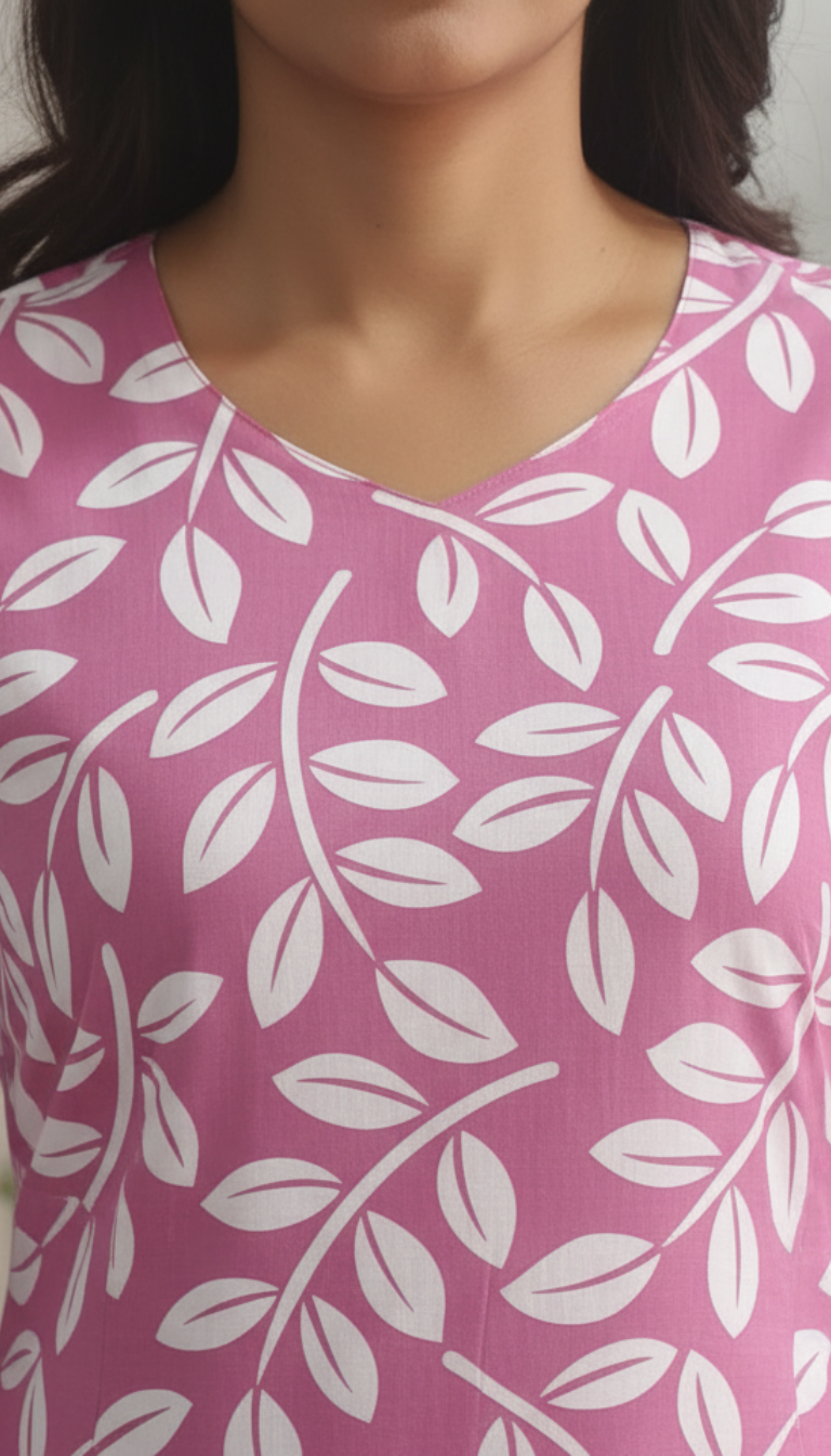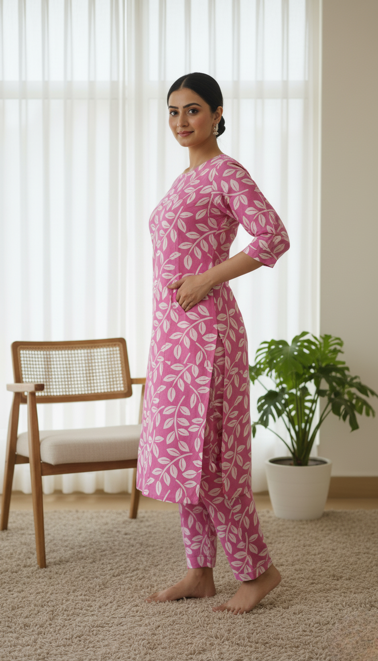 Stay effortlessly elegant in this charming pink cotton kurta set, adorned with all-over white leaf prints. Featuring a round neckline and three-quarter sleeves, this outfit offers a perfect blend of comfort and style. The matching straight pants complete the coordinated look, making it ideal for everyday wear, casual outings, or work-from-home chic. Crafted from breathable cotton fabric, this ensemble ensures all-day comfort with a touch of sophistication.