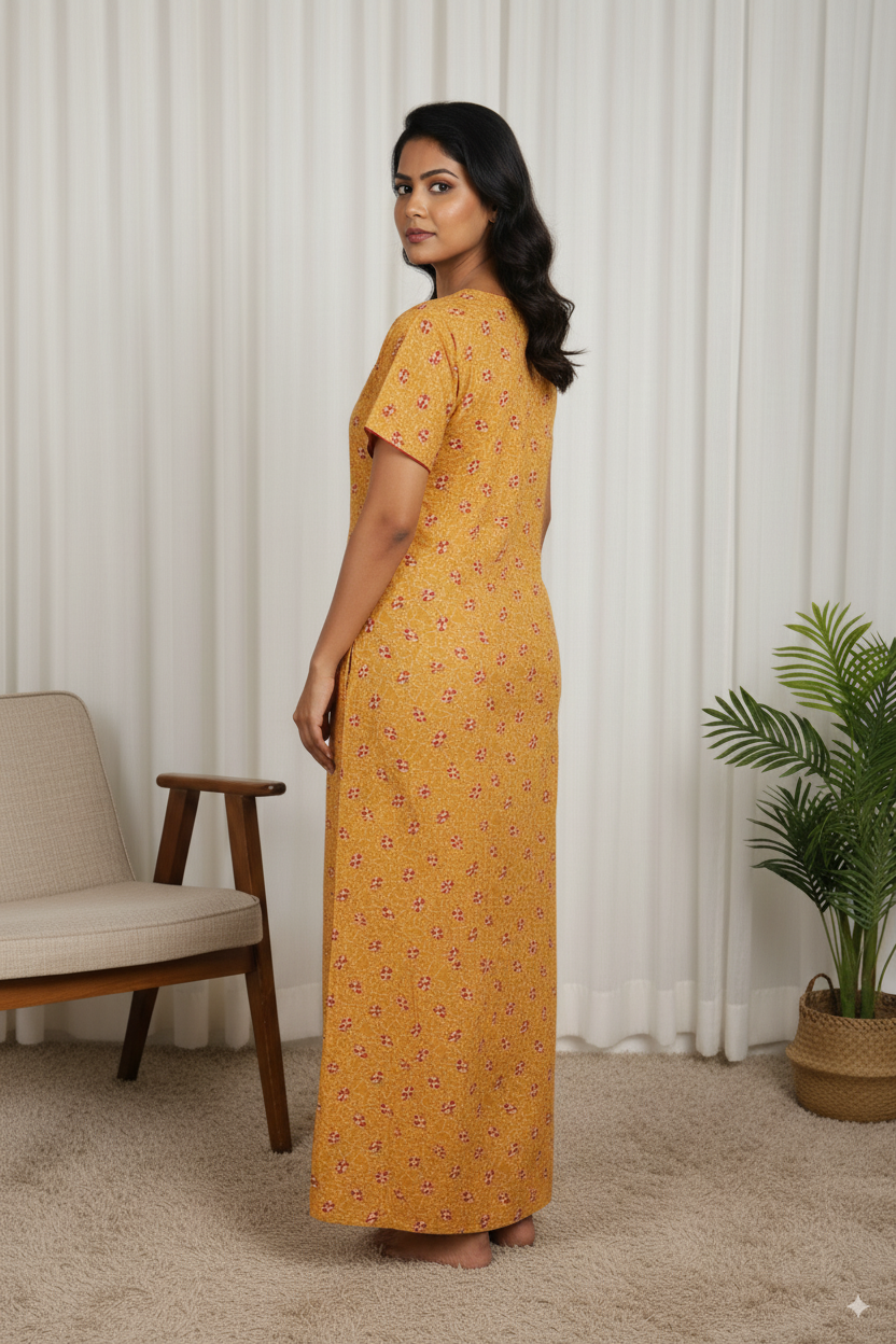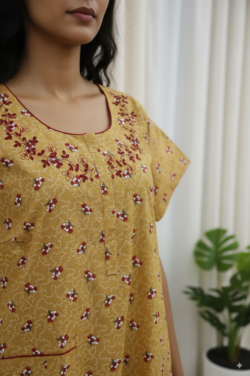 Stay comfortable and stylish in this elegant pink cotton nighty, featuring delicate all-over floral prints and beautifully embroidered neckline detailing. Designed with a soft scoop neck, short sleeves, and a convenient side pocket, this ankle-length nightwear is perfect for everyday comfort. The lightweight cotton fabric ensures breathability and ease, making it an ideal choice for relaxing at home or getting a good night’s sleep.