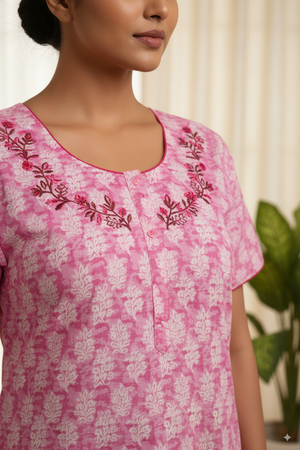 This elegant nighty is crafted from breathable cotton fabric, featuring a soothing pink base with delicate white floral print. The neckline is highlighted with intricate maroon floral embroidery, adding a graceful and feminine touch. Designed for comfort and style, it is perfect for both everyday wear and bedtime relaxation.