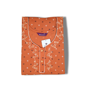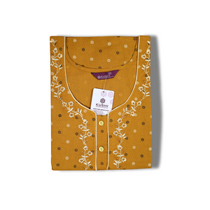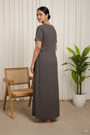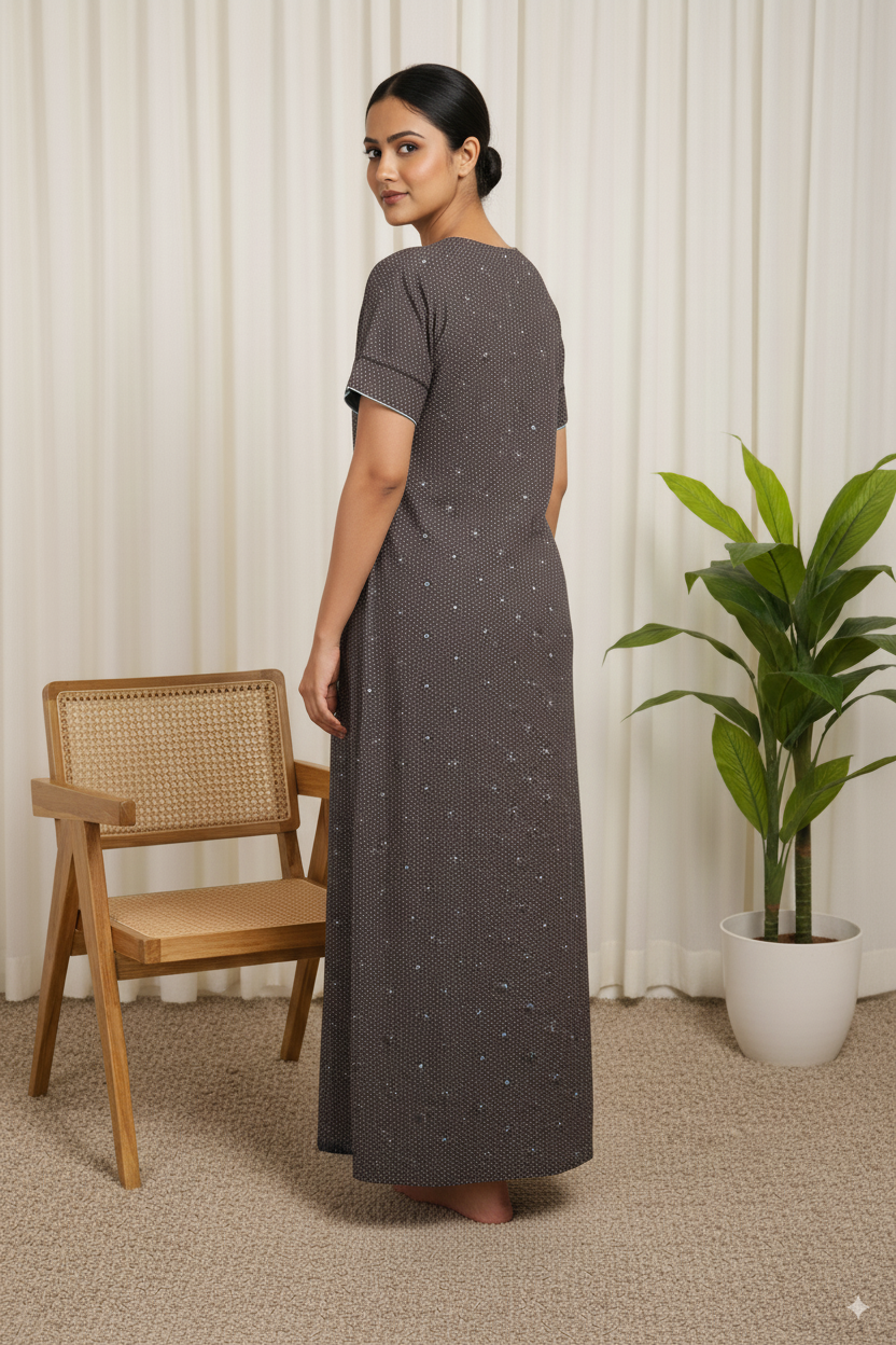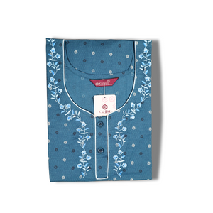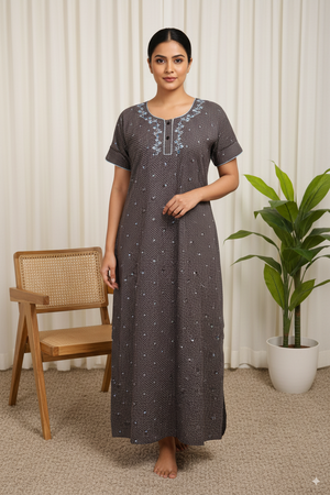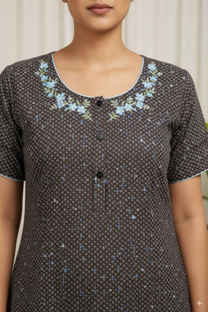 Elegant and comfortable, this Premium Cotton Black Nighty comes with sky blue floral embroidery near the neckline. The breathable cotton fabric ensures all-day comfort, while the subtle dotted pattern adds charm. Perfect for home & sleepwear.